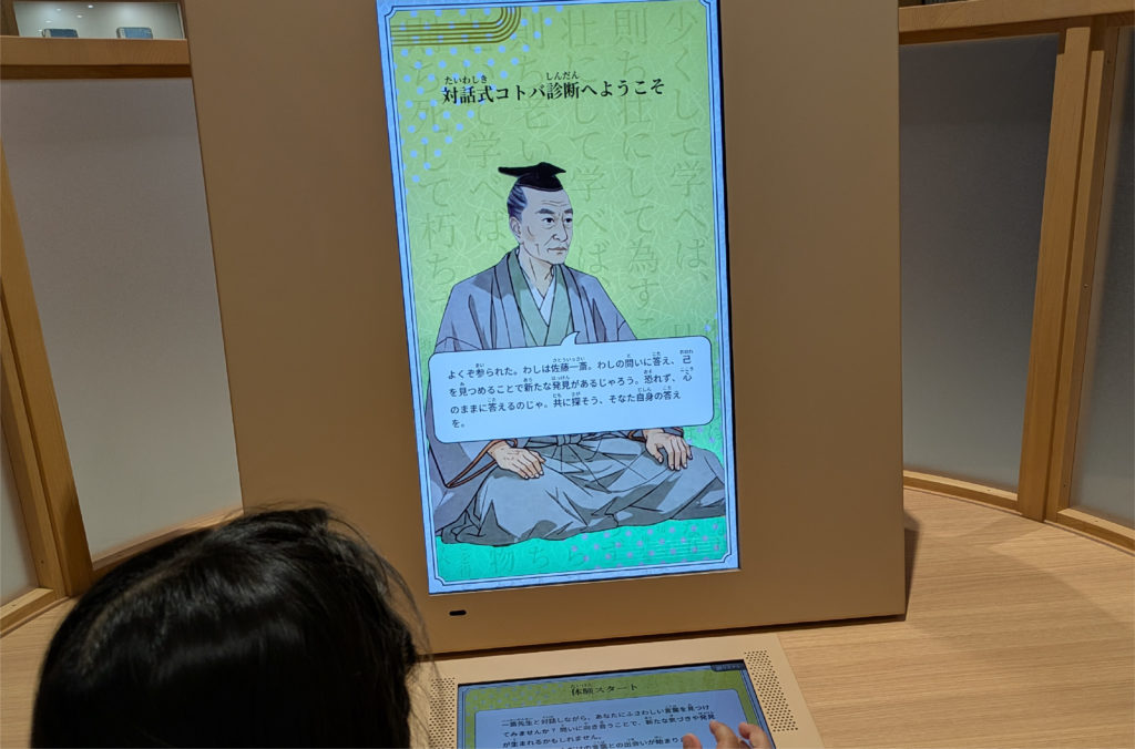 館内に入るとまず目に入るのは、モニターに映る佐藤一斎とタッチパネルで会話ができる「対話式コトバ診断」コーナーです。